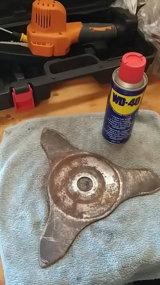 Špinavý a zahrdzavený trojzubec z krovinorezu som očistil brúsnym papierom, zakonzervoval ho produktom WD-40 na vytesnenie vlhkosti a takto je nástroj pripravený na budúce použitie. 👍